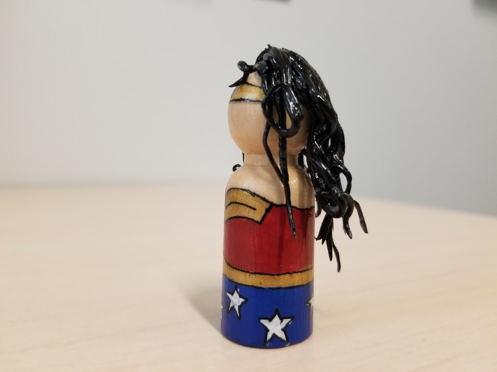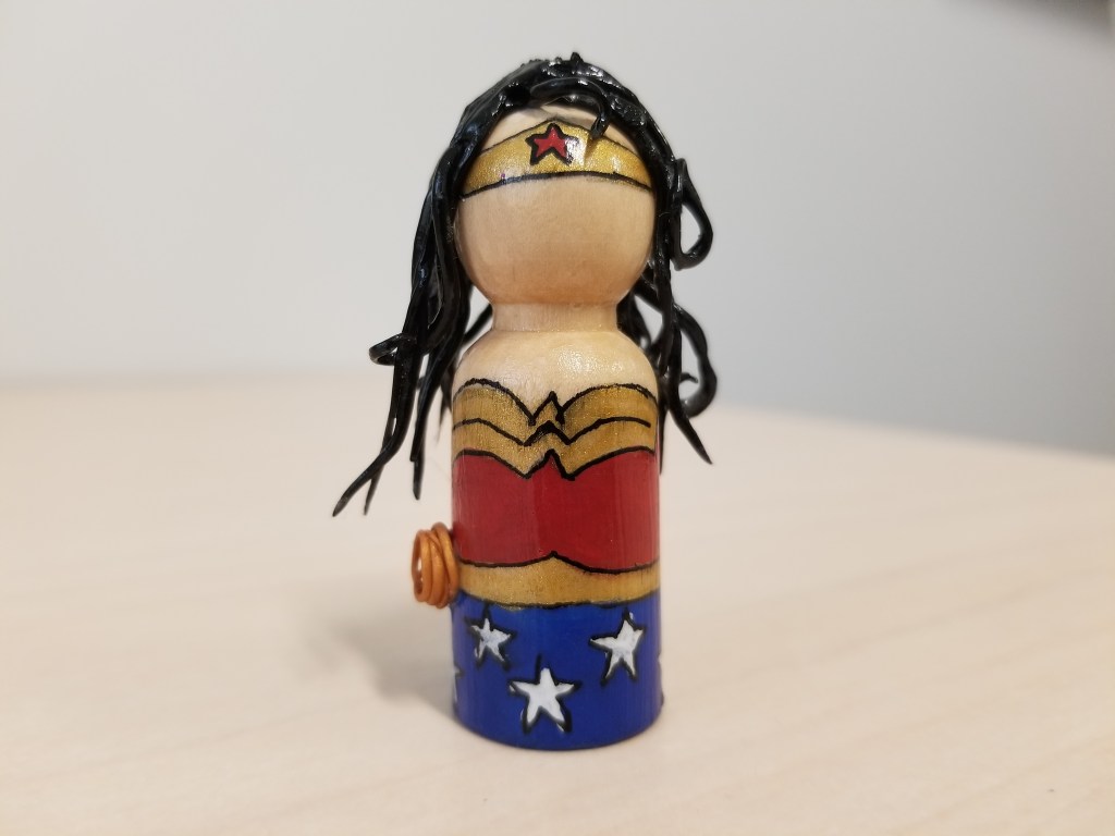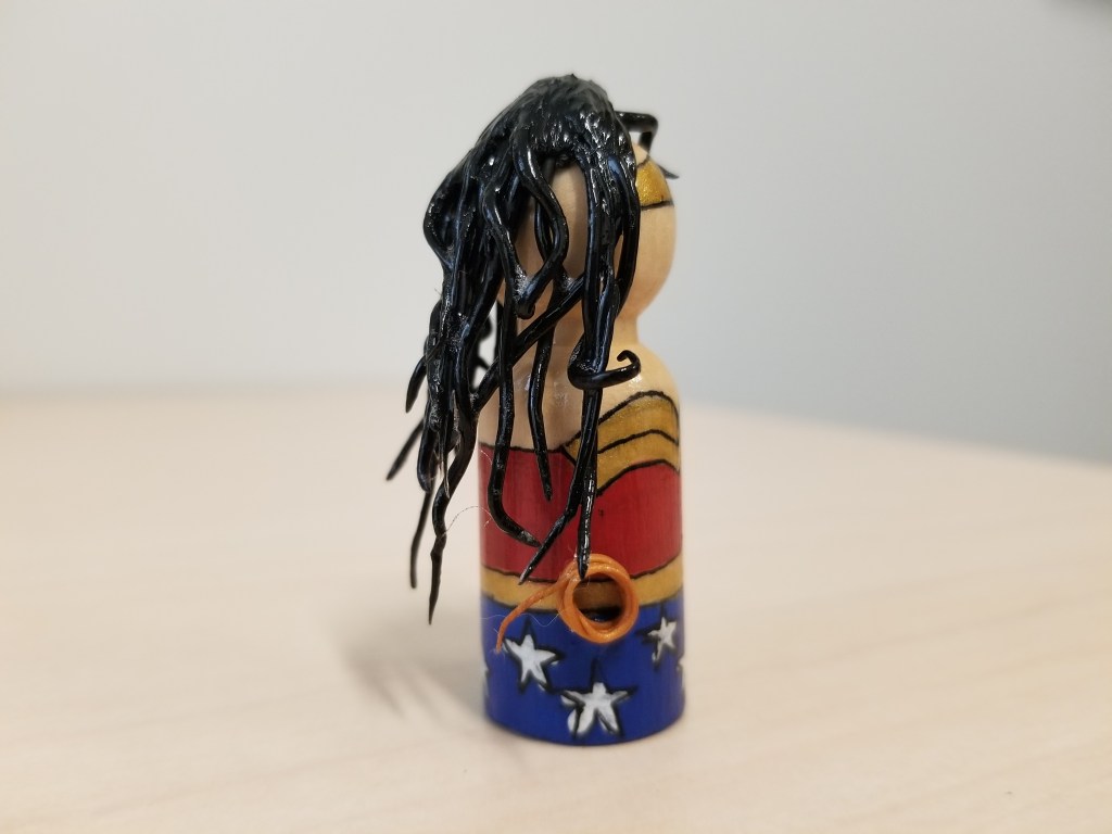 JL’s Platonic GF Craft Painting, Polymer Clay 2 3/4″ wooden peg dollAcrylic paintBlack ink penMod podgePolymer clay (hair and lasso) Related